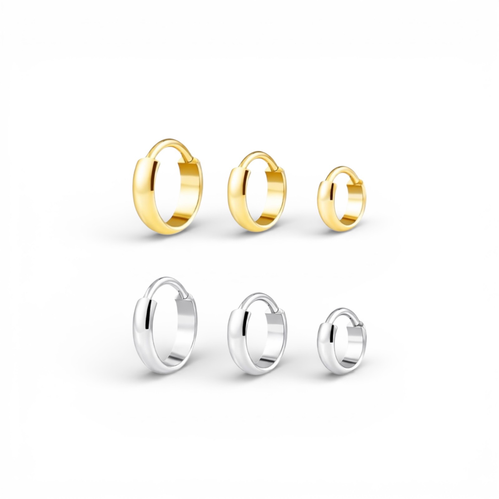 Erhältlich in Goldfarben und Silberfarben, lassen sich die Creolen vielseitig kombinieren. Dank der Größen 8 mm 10 mm und 12mm Durchmesser eignen sie sich ideal für einen modernen Layering-Look und können auch doppelt getragen werden.