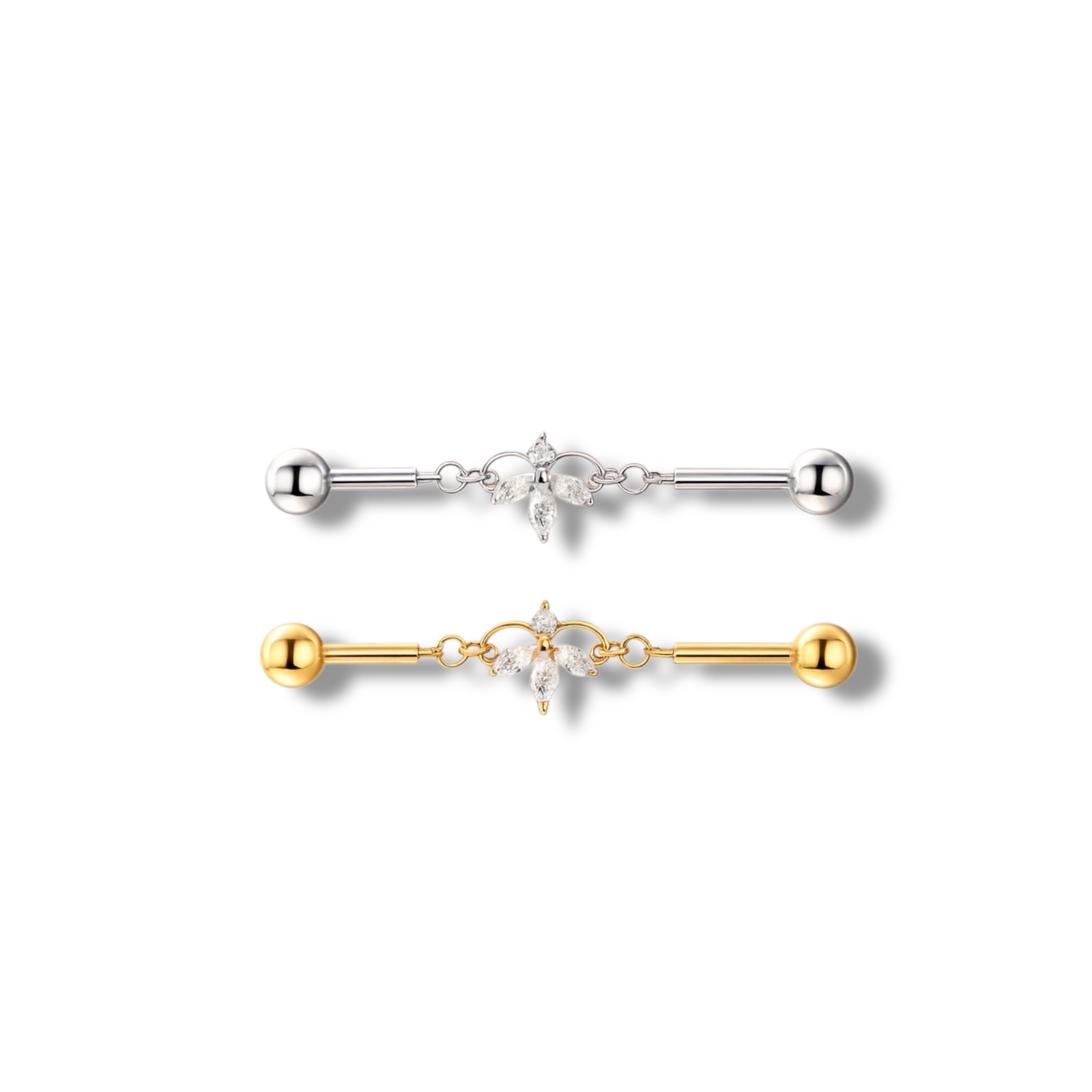 Setze ein funkelndes Statement mit diesem eleganten Industrial Piercing! Das Piercing besticht durch seinen edlen Zirkonia-Steinbesatz in einer zarten Blütenform, die dem Schmuckstück eine feminine und zugleich luxuriöse Note verleiht.